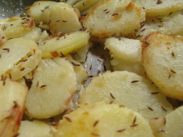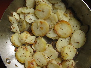 2) Heat the oil (and butter, if using) in a large fry pan. Layer potatoes into the pan and cook on medium heat. Turn frequently so they will brown evenly. When they begin to brown, scatter the caraway seeds and salt over the potatoes and toss. Cook another minute or two. The potatoes should be gently browned around the edges. Eat hot.