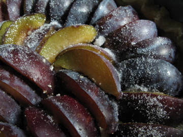 Let’s move on to dessert. Memory does not fail us when it comes to plum cake. The most ubiquitous of German cakes or tarts is as Jewish as it is German. Everyone in Europe has always been so enthralled with the small purple summer fruits when they come in season. And here on the East Coast of the United States we also await the short season for Italian plums. I usually bake at least one plum cake every September, maybe two. I use the short dough known in German as muerberteig, whereas some bakers prefer to make their plum cake on a yeast dough base, the hefenteig. The latter is often made in an elongated rectangular shape. Ours is always round, in an 8 or 9 inch pan. Plum cake is sweet and sour and fruity and ours has a light jelly glaze added on top. It is a harvest food, but also a bright way to inaugurate a New Year.