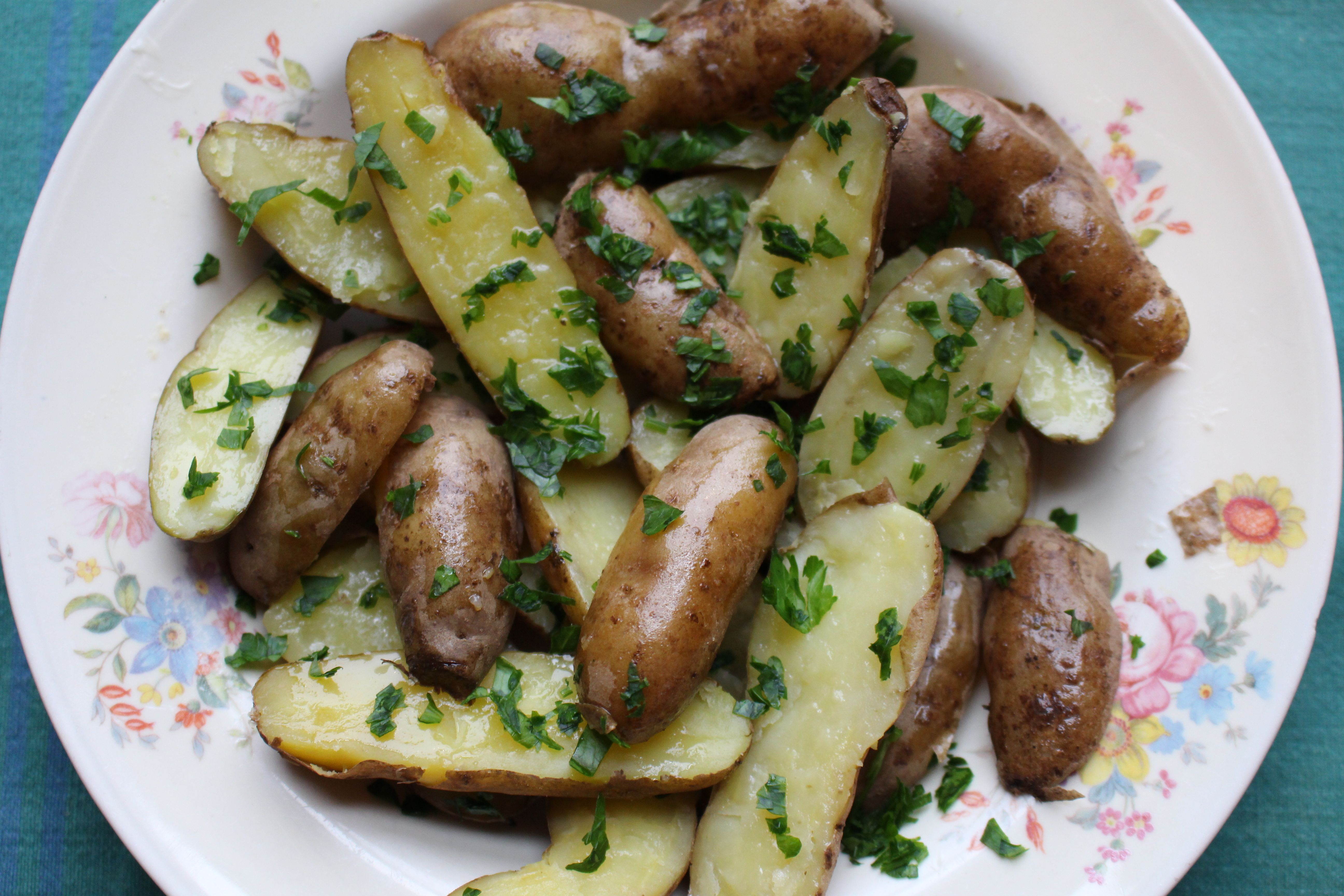 A recipe is hardly needed for this dish, but here are the simple steps. The amounts are variable, but figure on approximately one pound of potatoes for four people, with about one tablespoon of butter, one or two handfuls of chopped parsley, and salt and pepper to taste.
